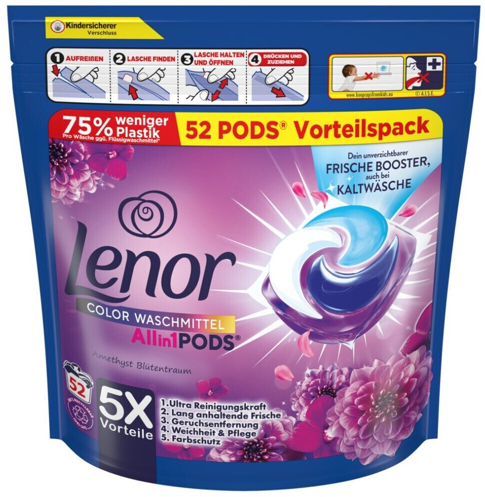 Tekoči pralni prašek Lenor Amethyst Color perilo temeljito opere, zagotovi čistočo in svež vonj. Z vonjem bergamonta v kombinaciji s prijetno frezijo in svetlim jasminom.