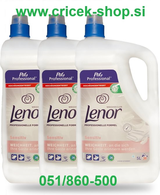 Lenor Professional Sensitive, 5 l, je mehčalec s svežim vonjem in izjemno koncentrirano formulo v ergonomski steklenički z nalivnikom, ki ne kaplja in ga je lahko dozirati. Deluje tudi po sušenju v sušilnem stroju in pomaga zmanjšati statični naboj tkanin. Posebej razvit za profesionalno uporabo.